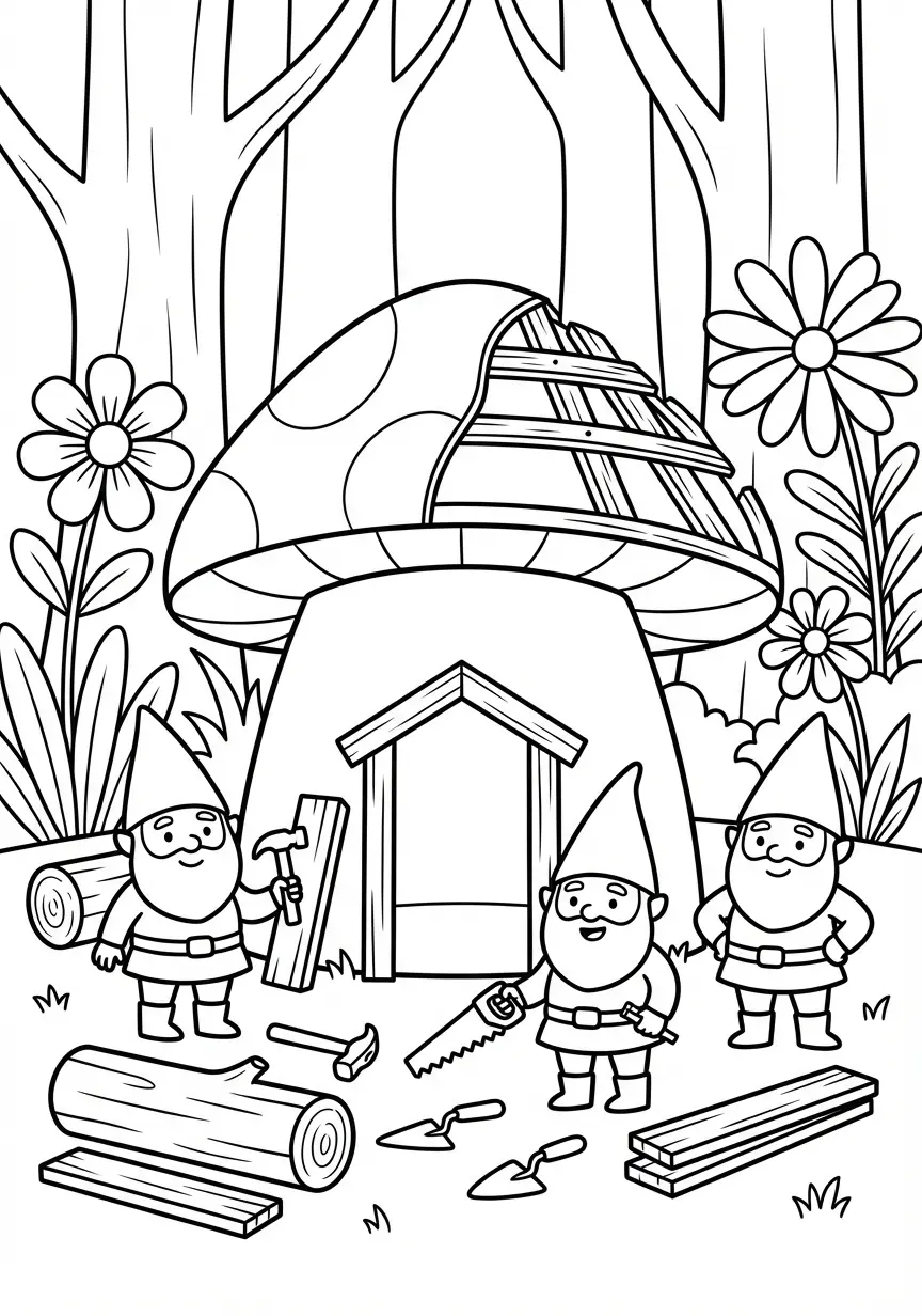Einfache Malvorlage von drei Wichteln mit Bauhelmen und großen Flächen zum Gestalten ihres Pilzhauses. Dieses Ausmalbild aus der Kategorie Wichtel kannst du kostenlos als PDF herunterladen oder direkt ausdrucken. Perfekt für Kinder, die gerne malen und kreativ sind.