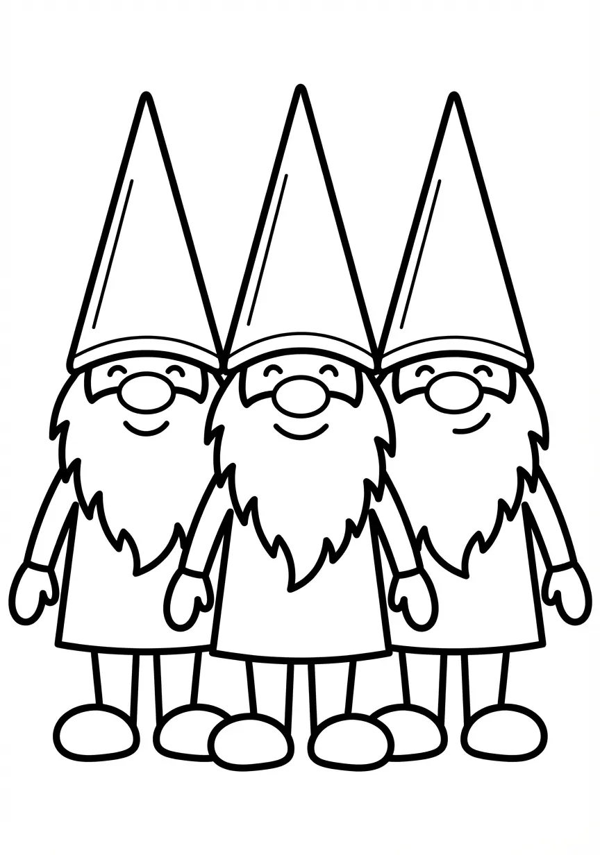 Einfache Malvorlage mit drei lächelnden Wichteln und großen Flächen zum Gestalten. In der Kategorie Wichtel findest du dieses Motiv im Schwierigkeitsgrad Einfach. Kostenlos herunterladen, ausdrucken und ausmalen.