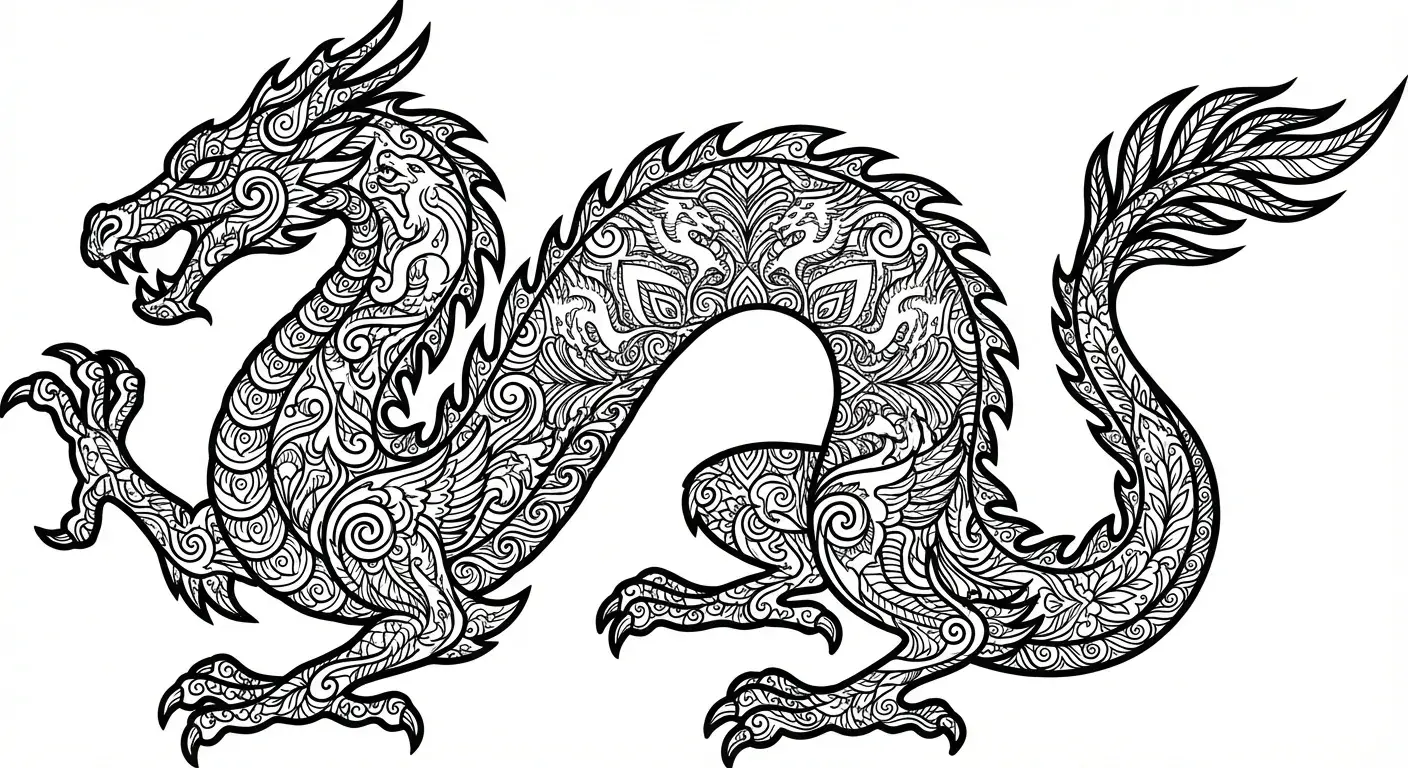 Eine markante Silhouette eines mächtigen Drachens, dessen gesamte Form dicht gef... ist ein Ausmalbild aus der Kategorie Drachen. Kostenlos als PDF herunterladen oder direkt ausdrucken. Perfekt für Kinder, die gerne malen und kreativ sind.