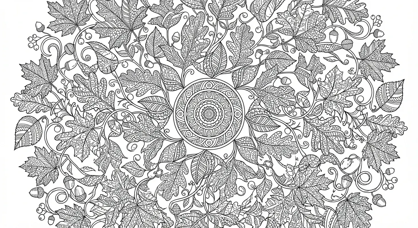 Ein komplexes kreisförmiges Mandala aus aufwendig gemusterten Herbstblättern, wi... ist ein Ausmalbild aus der Kategorie Herbst. Kostenlos als PDF herunterladen oder direkt ausdrucken. Perfekt für Kinder, die gerne malen und kreativ sind.