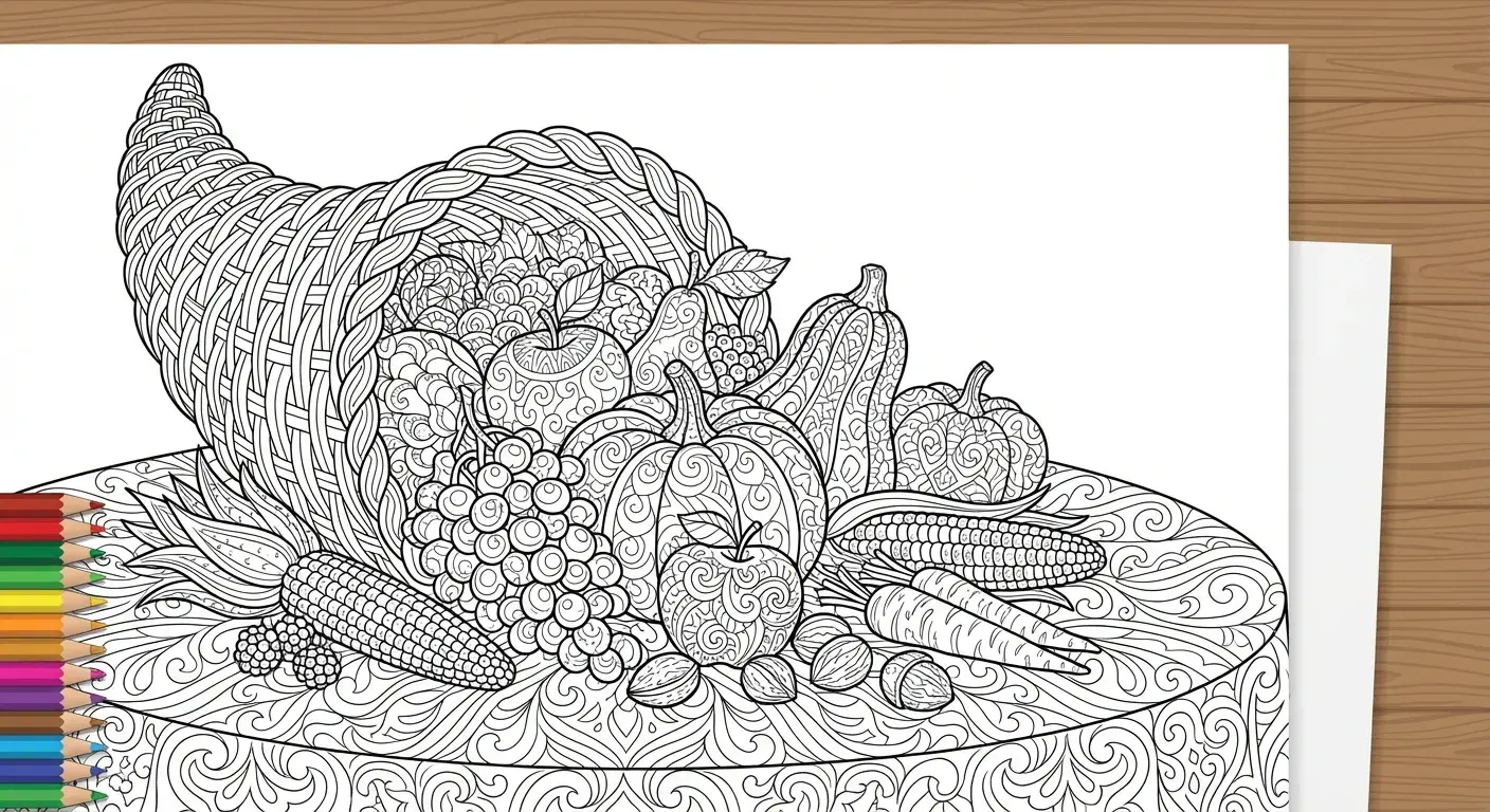 Ein überquellendes Füllhorn, gefüllt mit verschiedenen Früchten, Gemüse, Nüssen ... ist ein Ausmalbild aus der Kategorie Herbst. Kostenlos als PDF herunterladen oder direkt ausdrucken. Perfekt für Kinder, die gerne malen und kreativ sind.