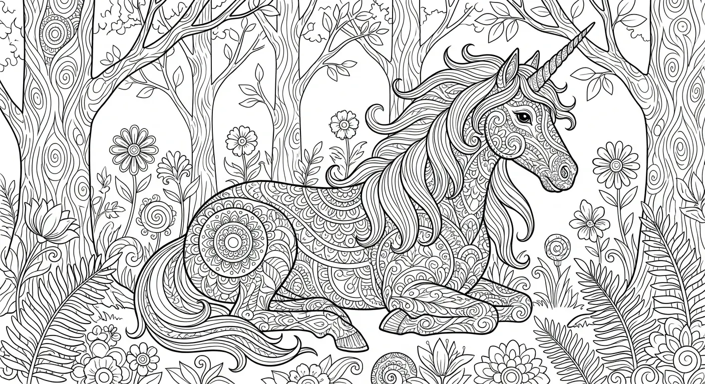 Verwunschene Ruhe: Ein Einhorn ruht im tiefen Zauberwald, wo jedes Blatt und jed... ist ein Ausmalbild aus der Kategorie Einhorn. Kostenlos als PDF herunterladen oder direkt ausdrucken. Perfekt für Kinder, die gerne malen und kreativ sind.