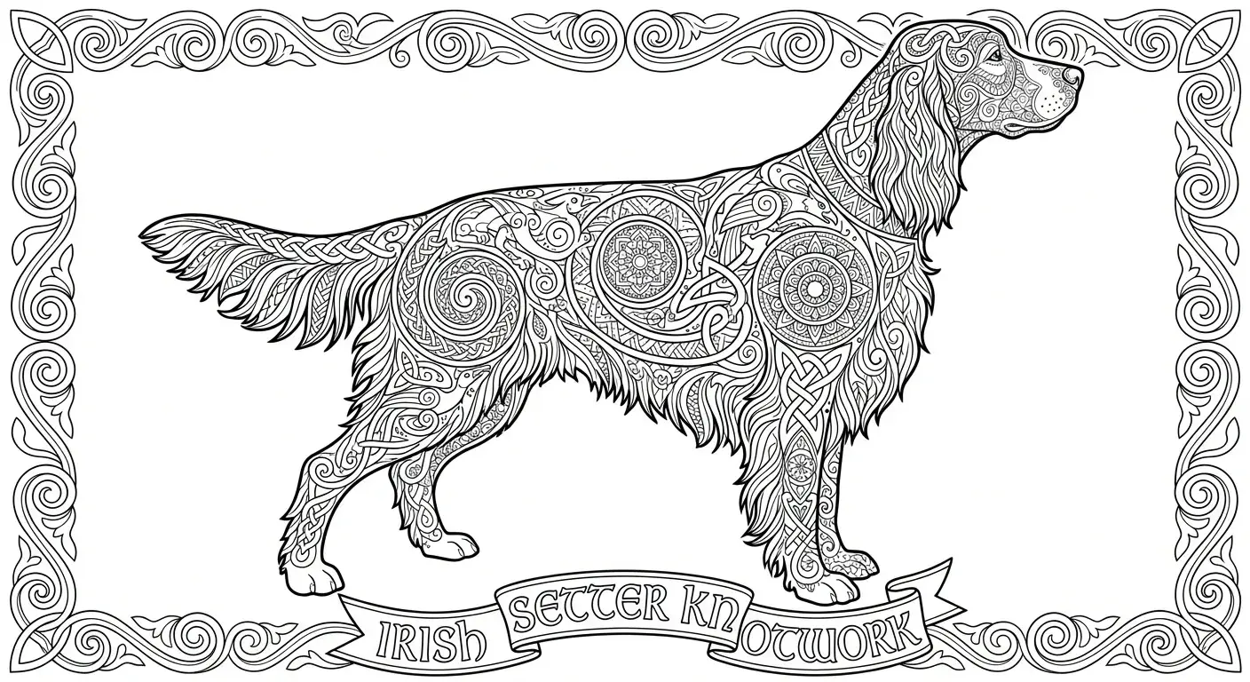 Eine Hundefigur, wie ein Irish Setter, dessen ganzer Körper kunstvoll aus durchg... ist ein Ausmalbild aus der Kategorie Hunde. Kostenlos als PDF herunterladen oder direkt ausdrucken. Perfekt für Kinder, die gerne malen und kreativ sind.