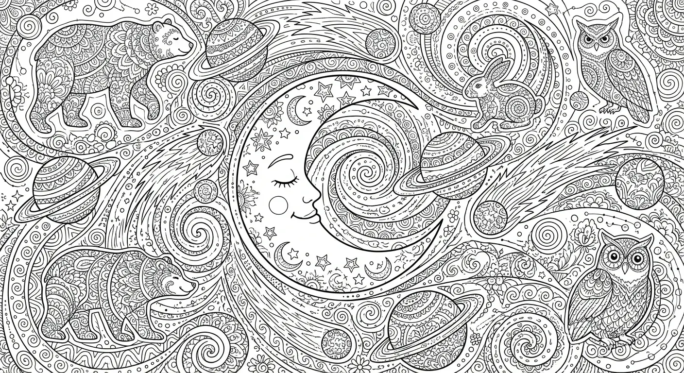 Eine kosmische Kawaii-Himmelsszene mit einem schlafenden Sichelmond mit komplizi... ist ein Ausmalbild aus der Kategorie Kawaii. Kostenlos als PDF herunterladen oder direkt ausdrucken. Perfekt für Kinder, die gerne malen und kreativ sind.