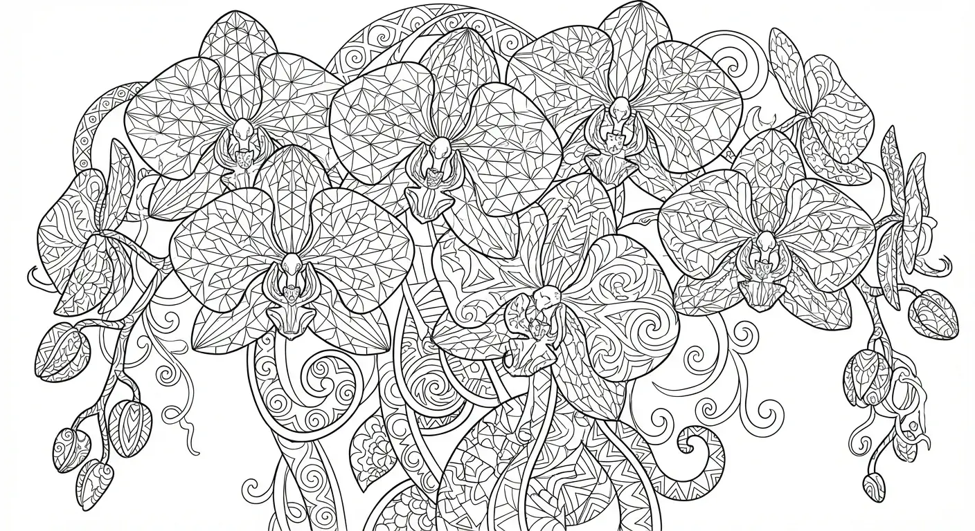 Eine Gruppe exotischer Orchideen mit Blütenblättern, die mit komplexen geometris... ist ein Ausmalbild aus der Kategorie Blumen. Kostenlos als PDF herunterladen oder direkt ausdrucken. Perfekt für Kinder, die gerne malen und kreativ sind.
