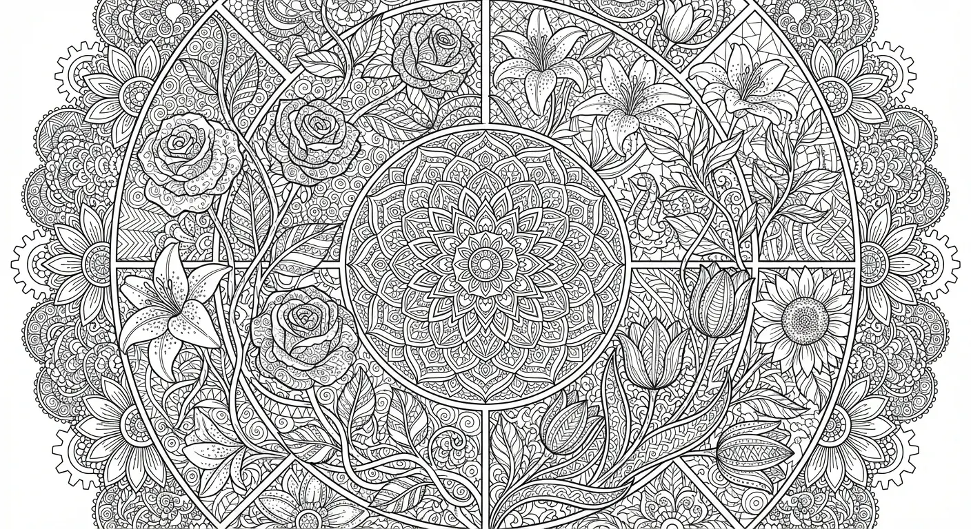 Eine große, kreisförmige Komposition, die einem Buntglasfenster ähnelt und versc... ist ein Ausmalbild aus der Kategorie Blumen. Kostenlos als PDF herunterladen oder direkt ausdrucken. Perfekt für Kinder, die gerne malen und kreativ sind.
