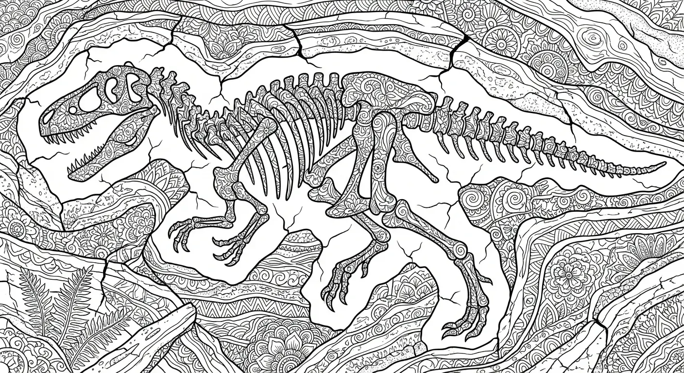 Ein aufwendig dargestelltes Dinosaurier-Fossil oder -Skelett, das komplexe Knoch... ist ein Ausmalbild aus der Kategorie Dinosaurier. Kostenlos als PDF herunterladen oder direkt ausdrucken. Perfekt für Kinder, die gerne malen und kreativ sind.