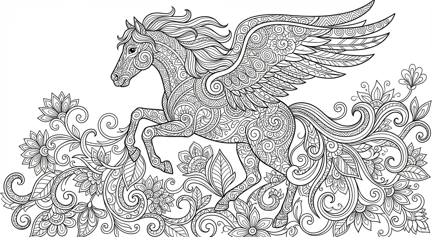 Pegasus in Blüte: Ein Pegasus, dessen Flügel nahtlos in ein Meer aus stilisierte... ist ein Ausmalbild aus der Kategorie Einhorn & Pegasus. Kostenlos als PDF herunterladen oder direkt ausdrucken. Perfekt für Kinder, die gerne malen und kreativ sind.