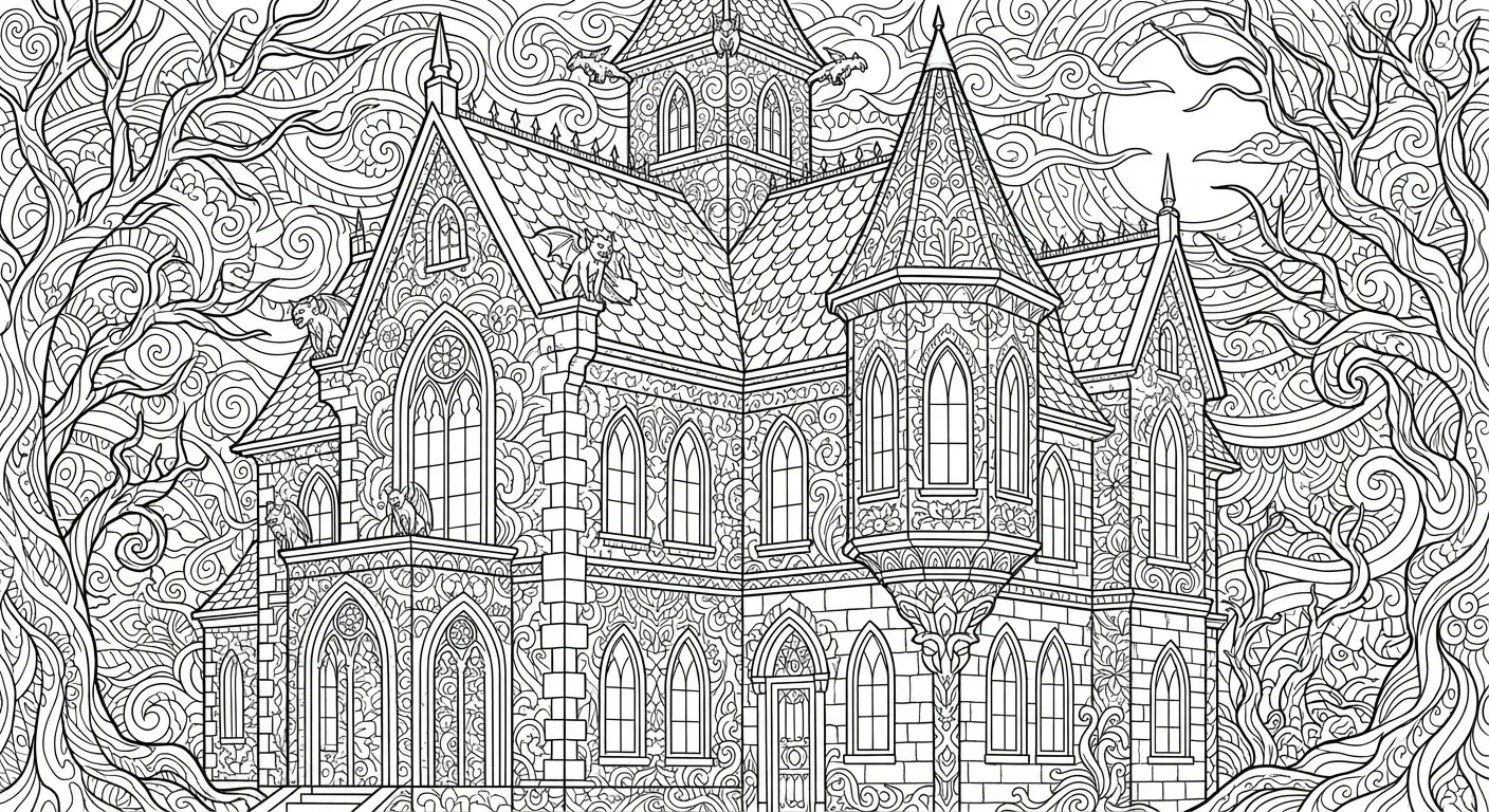 Eine gotische Villa, aufwendig detailliert mit Zentangle-Mustern auf Wänden, Dac... ist ein Ausmalbild aus der Kategorie Halloween. Kostenlos als PDF herunterladen oder direkt ausdrucken. Perfekt für Kinder, die gerne malen und kreativ sind.