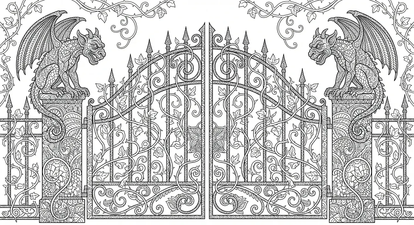 Aufwendige, schmiedeeiserne Friedhofstore, bedeckt mit Dornen und Efeu, bewacht ... ist ein Ausmalbild aus der Kategorie Halloween. Kostenlos als PDF herunterladen oder direkt ausdrucken. Perfekt für Kinder, die gerne malen und kreativ sind.