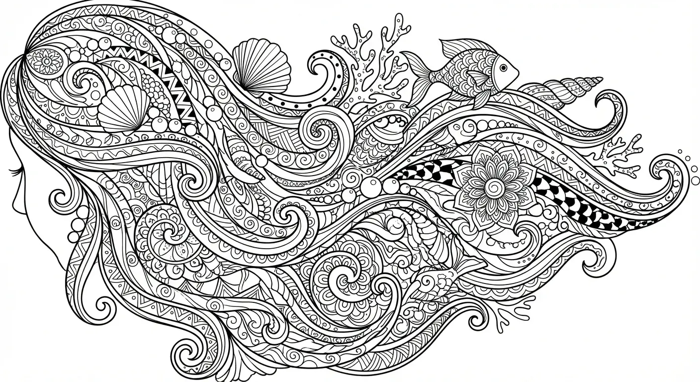 Aufwendiges, fließendes Haar einer Meerjungfrau, kunstvoll verwoben mit Muscheln... ist ein Ausmalbild aus der Kategorie Meerjungfrau. Kostenlos als PDF herunterladen oder direkt ausdrucken. Perfekt für Kinder, die gerne malen und kreativ sind.