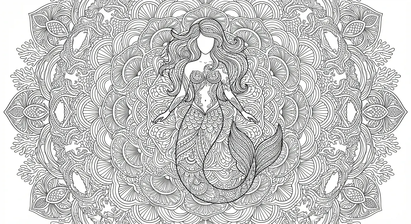 Eine zentrale Meerjungfrauenfigur, nahtlos in ein aufwendiges kreisförmiges Mand... ist ein Ausmalbild aus der Kategorie Meerjungfrau. Kostenlos als PDF herunterladen oder direkt ausdrucken. Perfekt für Kinder, die gerne malen und kreativ sind.