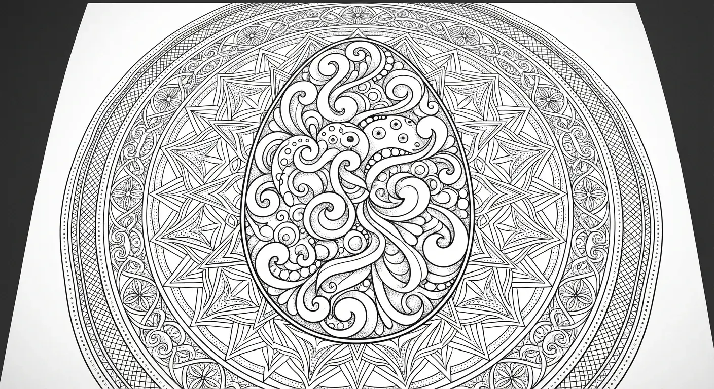 Zentangle-Ei: Ein ovales Kunstwerk, gefüllt mit 'Mooka' Wirbeln, 'Flux' Blättern... ist ein Ausmalbild aus der Kategorie Ostern. Kostenlos als PDF herunterladen oder direkt ausdrucken. Perfekt für Kinder, die gerne malen und kreativ sind.