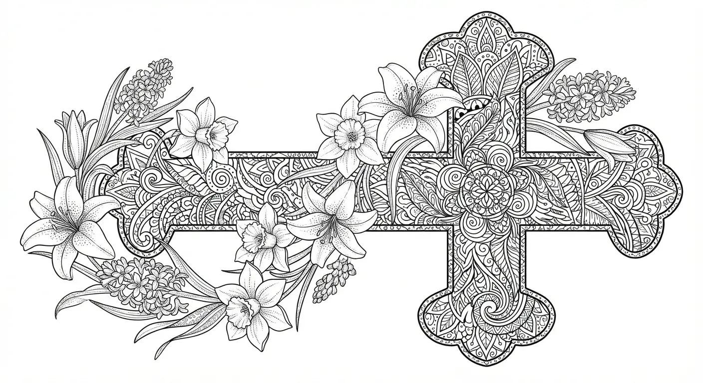 Oster-Kreuz: Ein Kreuz, verziert mit einem Mosaik aus Mustern und einer Girlande... ist ein Ausmalbild aus der Kategorie Ostern. Kostenlos als PDF herunterladen oder direkt ausdrucken. Perfekt für Kinder, die gerne malen und kreativ sind.
