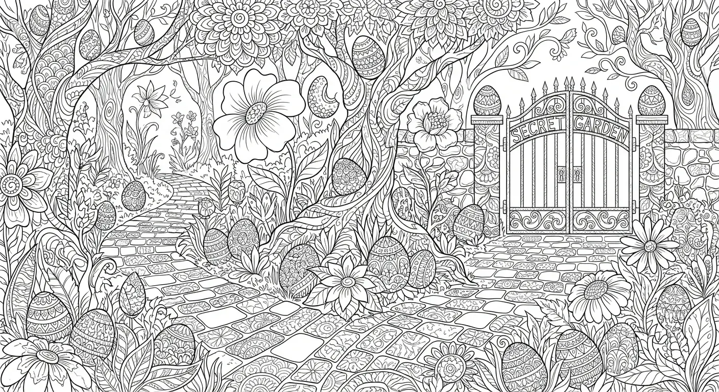 Geheimer Garten: Eine wimmelige Szene voller Pflanzen und versteckter Ostereier,... ist ein Ausmalbild aus der Kategorie Ostern. Kostenlos als PDF herunterladen oder direkt ausdrucken. Perfekt für Kinder, die gerne malen und kreativ sind.