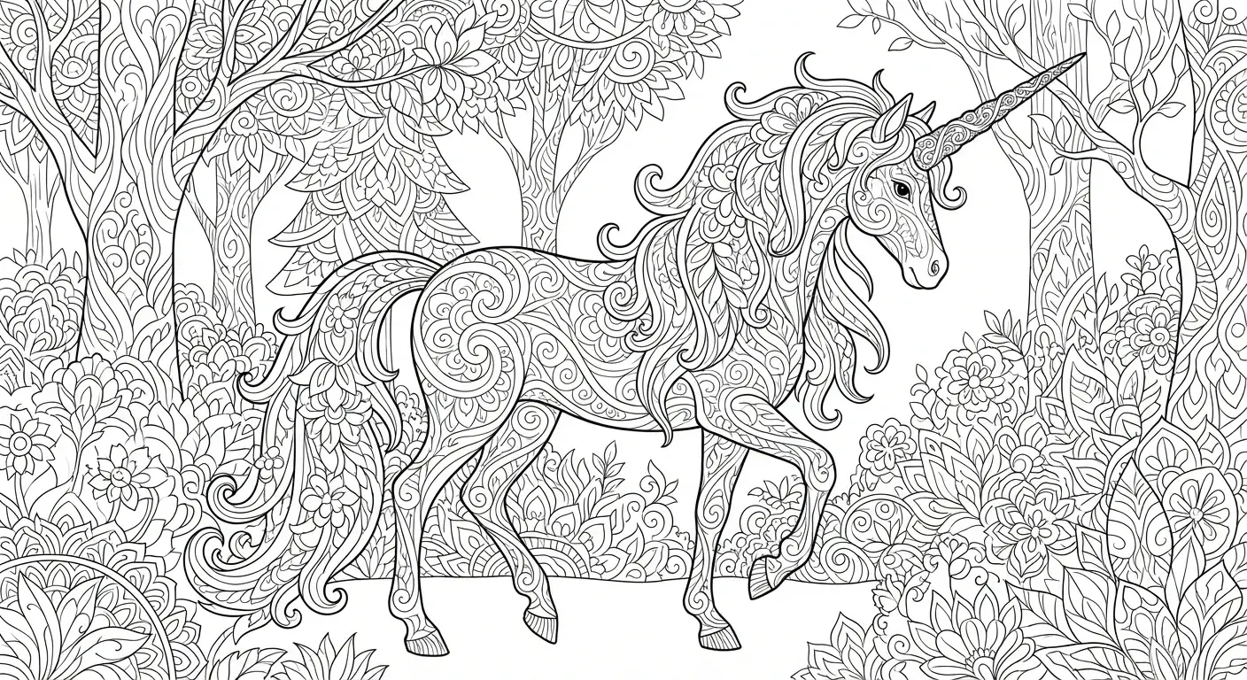 Waldgeist: Ein Einhorn im dichten Blätterwerk, fast unsichtbar getarnt durch die... ist ein Ausmalbild aus der Kategorie Pferde. Kostenlos als PDF herunterladen oder direkt ausdrucken. Perfekt für Kinder, die gerne malen und kreativ sind.