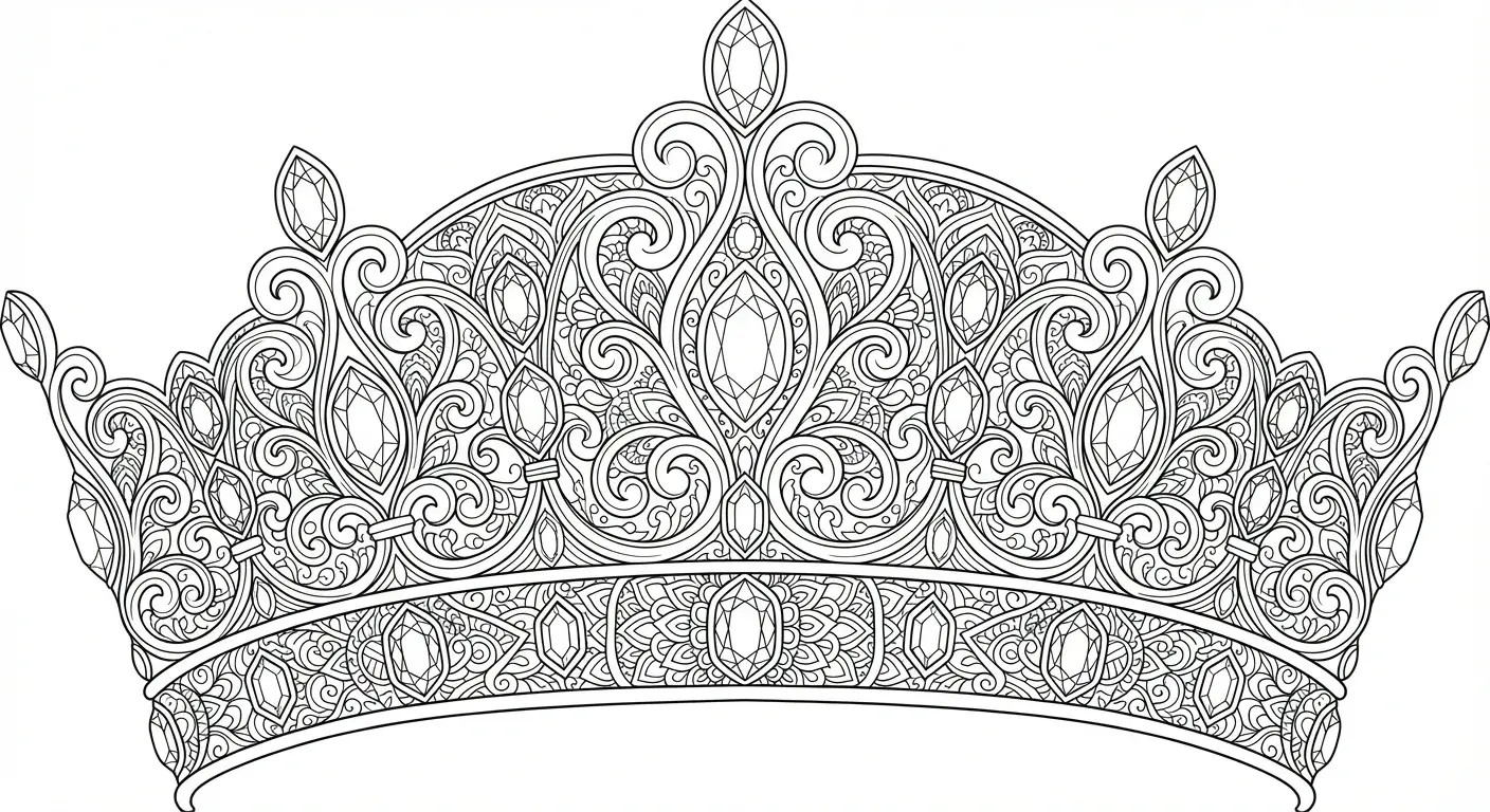 Eine prunkvolle königliche Krone, kunstvoll verziert mit Filigranmustern, Edelst... ist ein Ausmalbild aus der Kategorie Prinzessin. Kostenlos als PDF herunterladen oder direkt ausdrucken. Perfekt für Kinder, die gerne malen und kreativ sind.