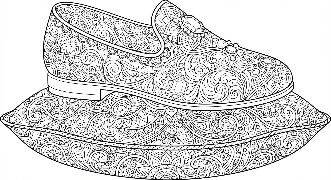 Ein zarter, mit Juwelen besetzter Schuh, der auf einem gemusterten Kissen ruht, ... ist ein Ausmalbild aus der Kategorie Prinzessin. Kostenlos als PDF herunterladen oder direkt ausdrucken. Perfekt für Kinder, die gerne malen und kreativ sind.
