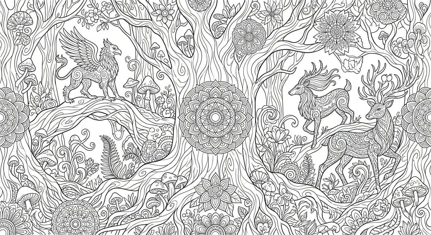 Verzauberte Waldlandschaft mit verschlungenen Wurzeln, mystischen Kreaturen und ... ist ein Ausmalbild aus der Kategorie Ausmalbilder Erwachsene. Kostenlos als PDF herunterladen oder direkt ausdrucken. Perfekt für Kinder, die gerne malen und kreativ sind.