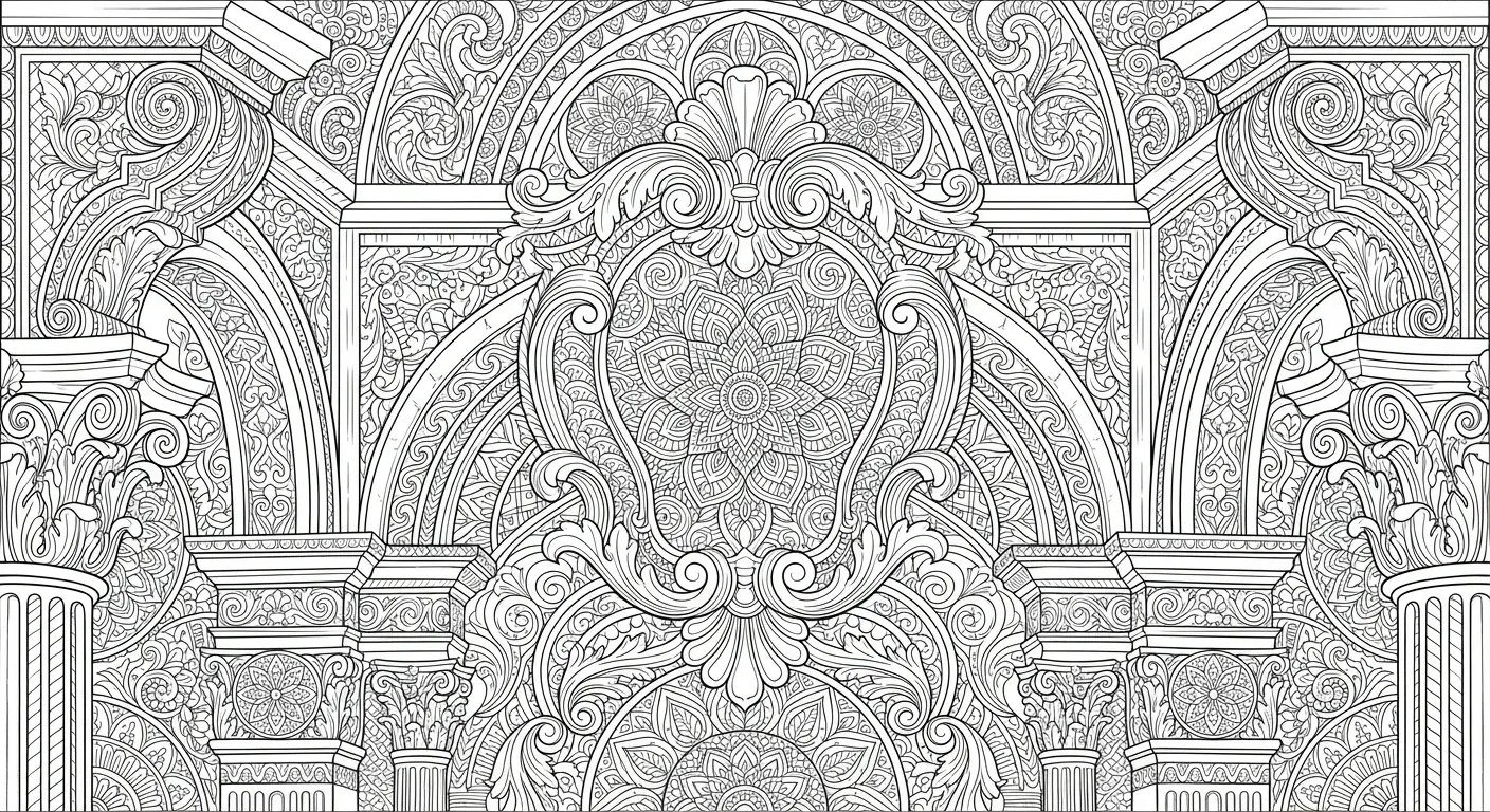 Verzierte barocke Architekturdetails mit komplexen Schnitzereien, Ranken und Ver... ist ein Ausmalbild aus der Kategorie Ausmalbilder Erwachsene. Kostenlos als PDF herunterladen oder direkt ausdrucken. Perfekt für Kinder, die gerne malen und kreativ sind.