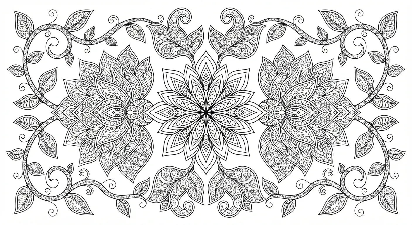 Symmetrisches Blumenarrangement mit hochdetaillierten Blüten, Blättern und versc... ist ein Ausmalbild aus der Kategorie Ausmalbilder Erwachsene. Kostenlos als PDF herunterladen oder direkt ausdrucken. Perfekt für Kinder, die gerne malen und kreativ sind.