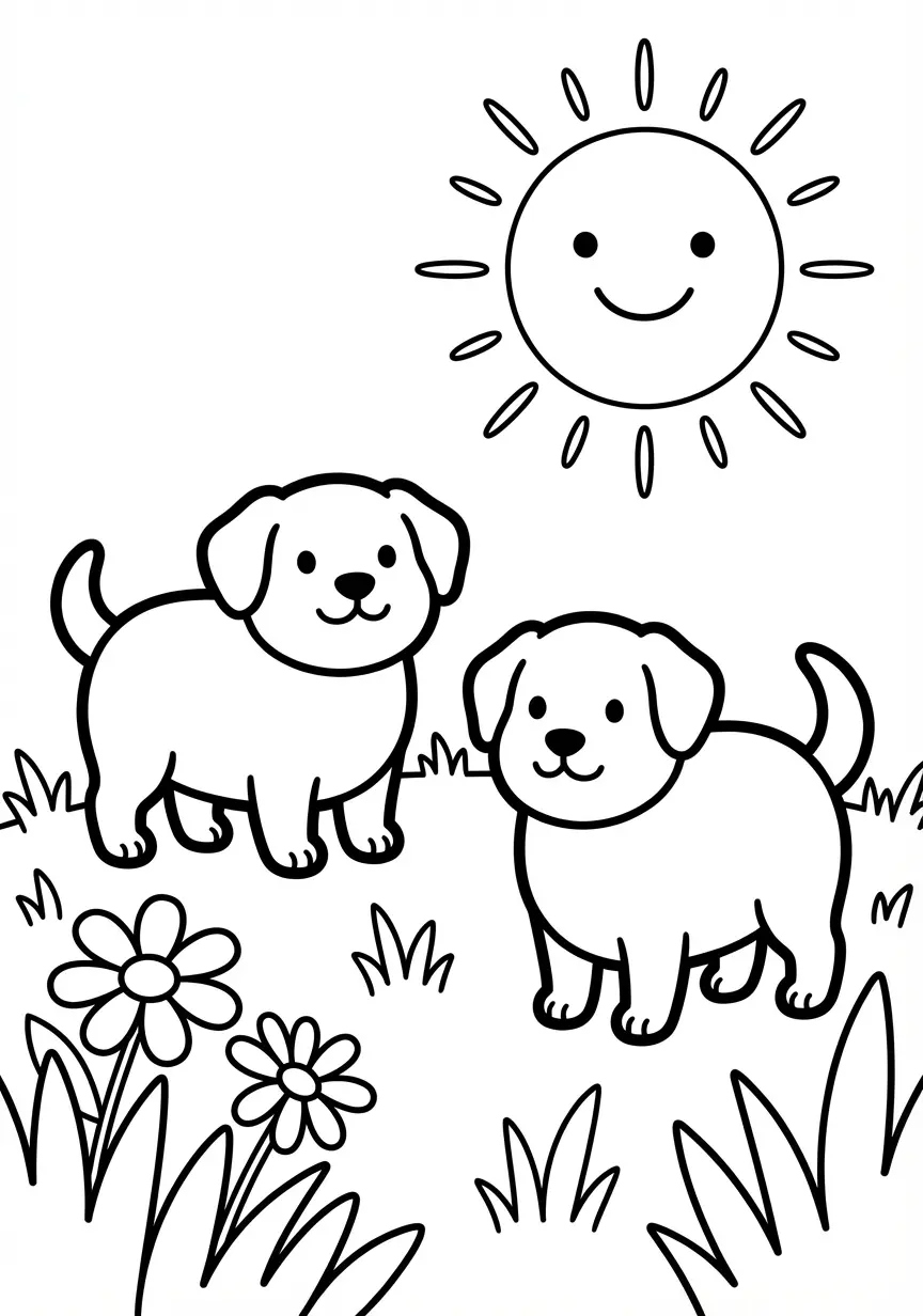 Einfache Malvorlage mit zwei lachenden Hunden und großen Blumenflächen zum Gestalten für Anfänger. In der Kategorie Hunde findest du dieses Motiv im Schwierigkeitsgrad Einfach. Kostenlos herunterladen, ausdrucken und ausmalen.
