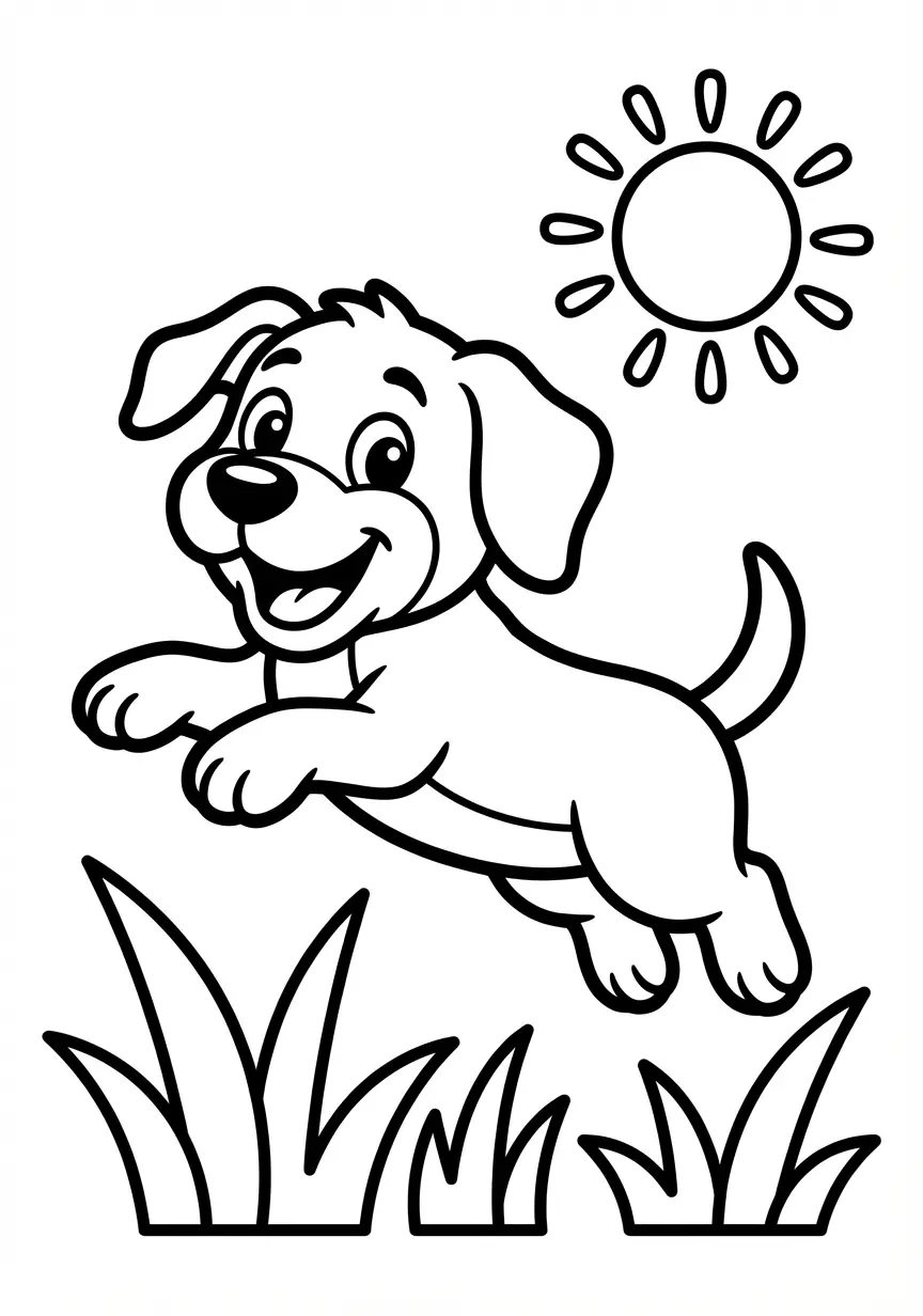 Einfache Malvorlage eines glücklichen Hundes, der mit großen Flächen für Anfänger in die Luft springt. In der Kategorie Hunde findest du dieses Motiv im Schwierigkeitsgrad Einfach. Kostenlos herunterladen, ausdrucken und ausmalen.