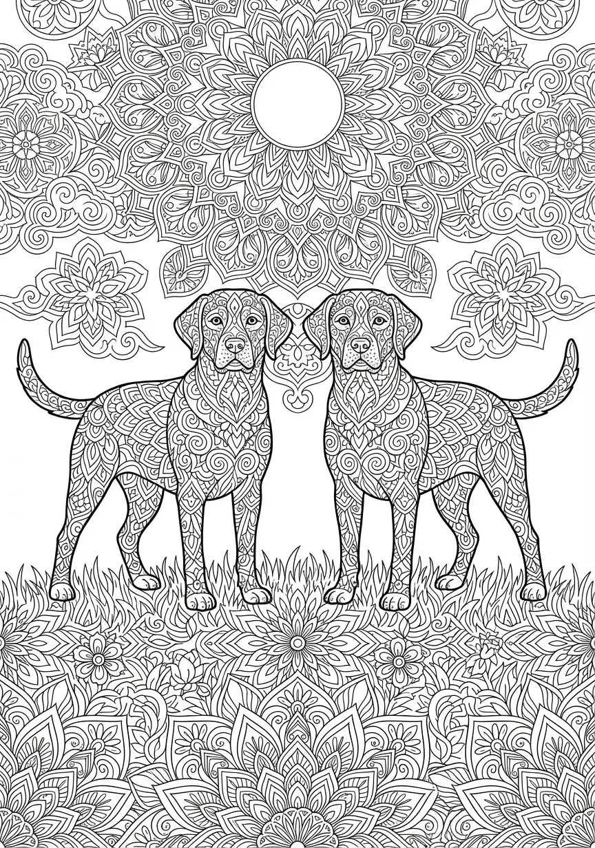 Komplexe Malvorlage eines filigranen Mandalas mit zwei Hunden, gefüllt mit zahlreichen kleinen floralen Mustern. Diese Vorlage aus Hunde gibt es kostenlos als PDF zum Download. Ideal, um sofort mit dem Ausmalen zu starten.
