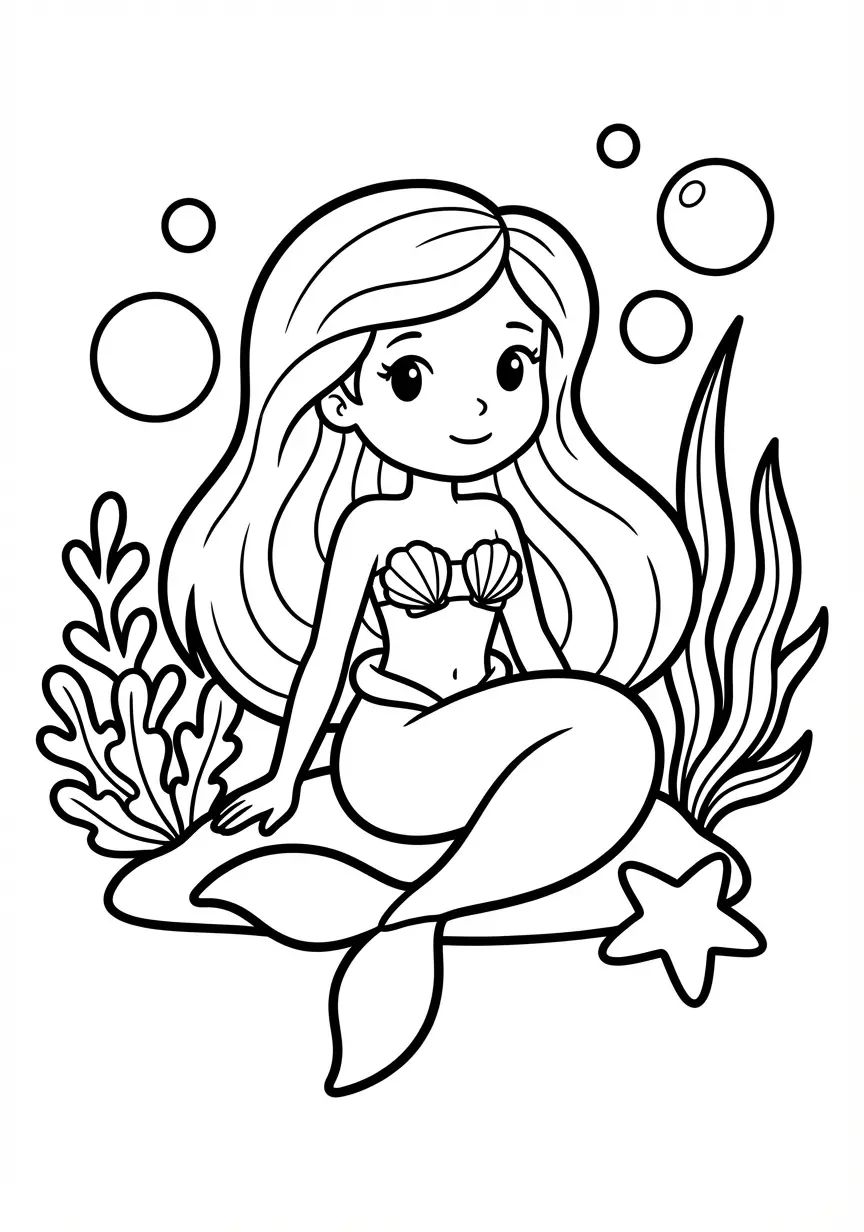 Malvorlage einer sehr einfachen Meerjungfrau mit einem Seestern in der Hand und mit großen, klaren Feldern für Anfänger. Dieses Ausmalbild aus der Kategorie Meerjungfrau kannst du kostenlos als PDF herunterladen oder direkt ausdrucken. Perfekt für Kinder, die gerne malen und kreativ sind.