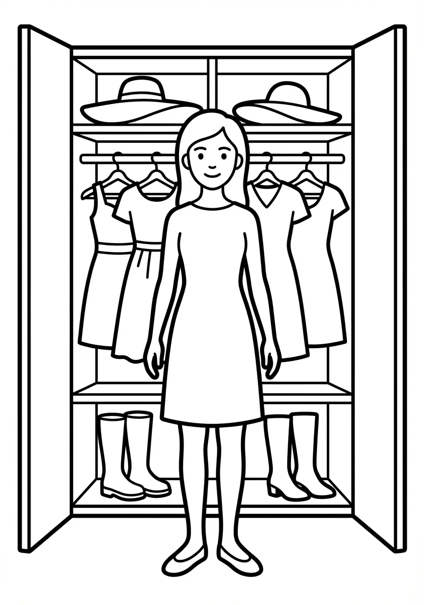 Einfache Malvorlage einer Frau vor ihrer offenen Garderobe mit grossen Flächen zum Gestalten. Das Motiv ist Teil der Kategorie Models & Mode und eignet sich mit dem Schwierigkeitsgrad Einfach für entspannte Malmomente. Kostenlos als PDF oder direkt zum Drucken.