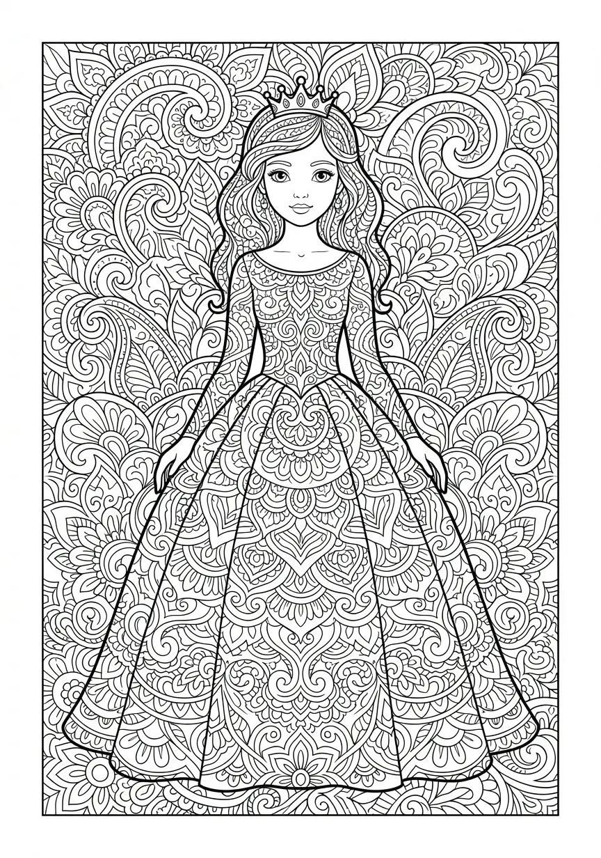 Detaillierte Mandala Malvorlage einer Prinzessin, deren gesamtes Kleid mit unzähligen feinen Mustern und filigranen Ornamenten verziert ist. Dieses Ausmalbild aus der Kategorie Prinzessin & Prinz kannst du kostenlos als PDF herunterladen oder direkt ausdrucken. Perfekt für Kinder, die gerne malen und kreativ sind.