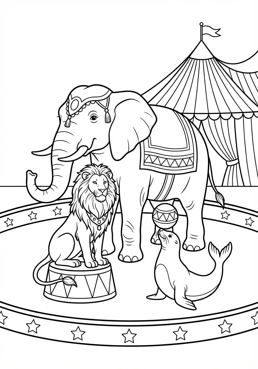 Ausgewogene Malvorlage mit einem Elefanten, einem Löwen und einem Seehund in einer detailreichen Zirkusarena. Dieses Ausmalbild aus der Kategorie Zirkus kannst du kostenlos als PDF herunterladen oder direkt ausdrucken. Perfekt für Kinder, die gerne malen und kreativ sind.